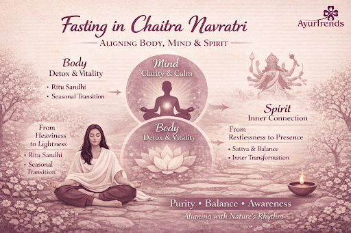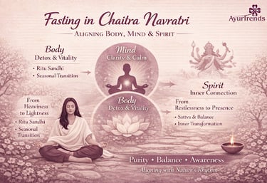 Discover how fasting during Chaitra Navratri aligns body, mind, and spirit. Learn Ayurvedic insights on seasonal detox, Ritu Sandhi, and mindful nourishment for holistic wellness.